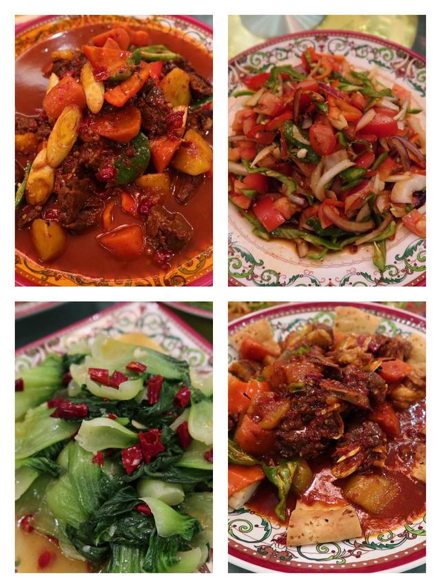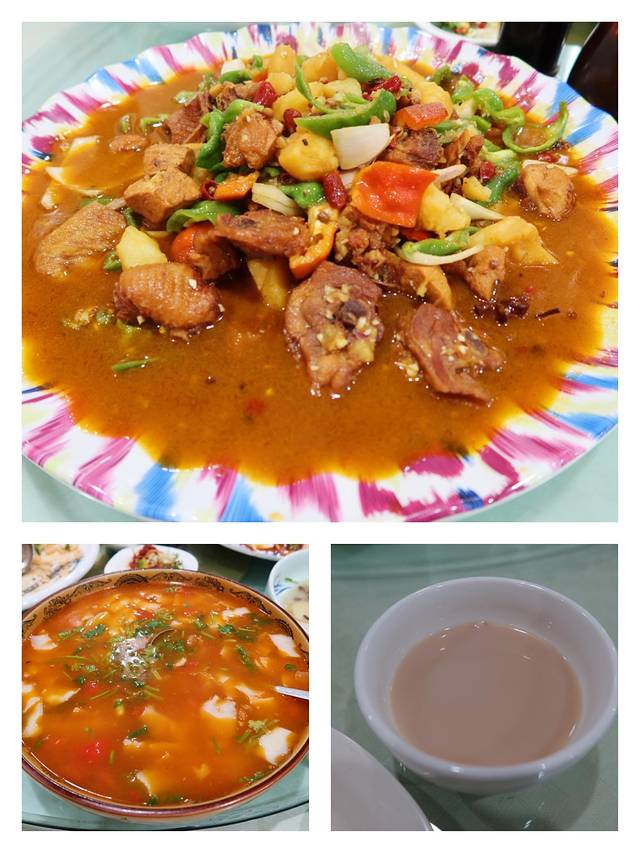第一餐肯定是要试试新疆大盘鸡的,另外点了拔丝红薯、哈萨克土豆等,值得一提的是,新疆的奶茶是咸咸的,奶香味和茶味儿都不重,入口的味道我们一行人都不太能接受。