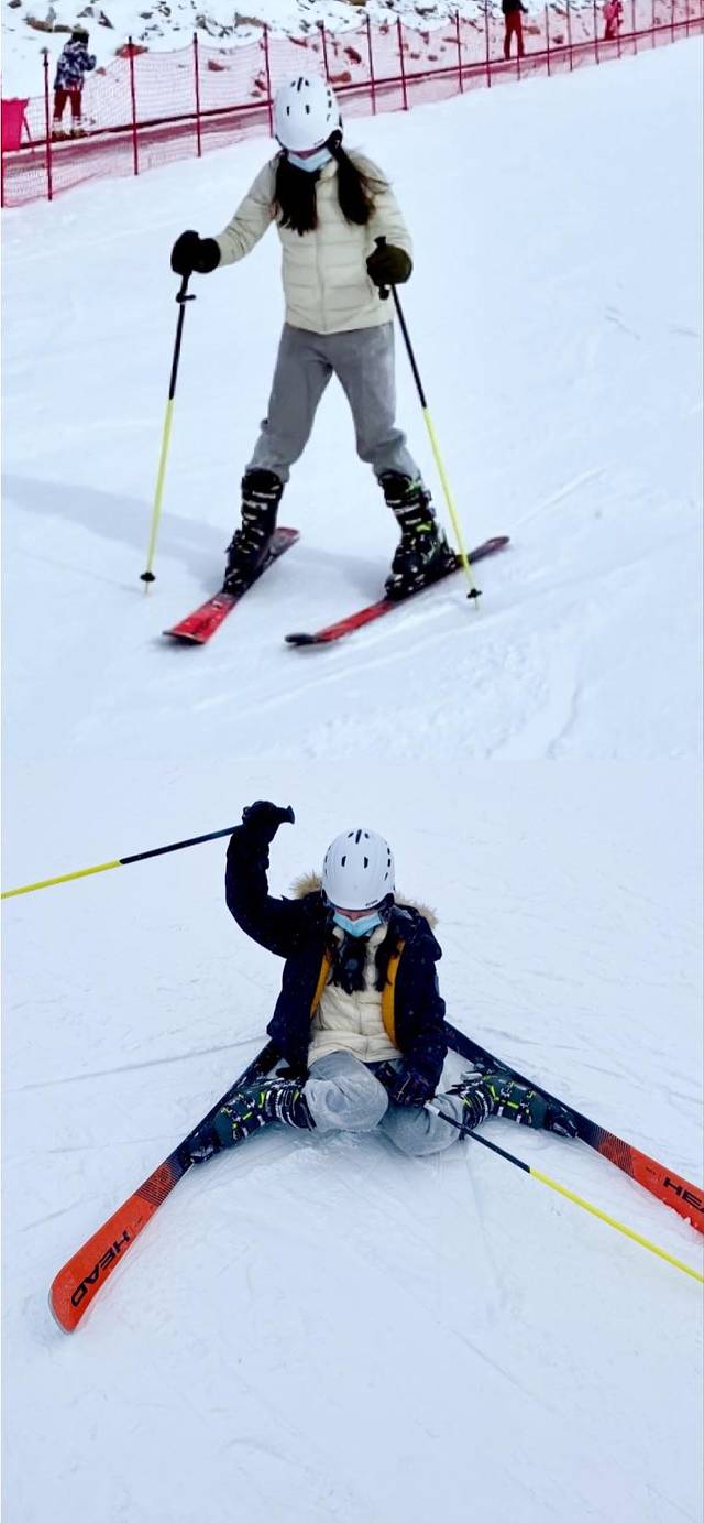 因为是第一次滑雪,第一圈的时候,滑雪板都踩不上去。接着便是不停摔不停晃晃悠悠站起来又以另一种姿势摔下去。😂