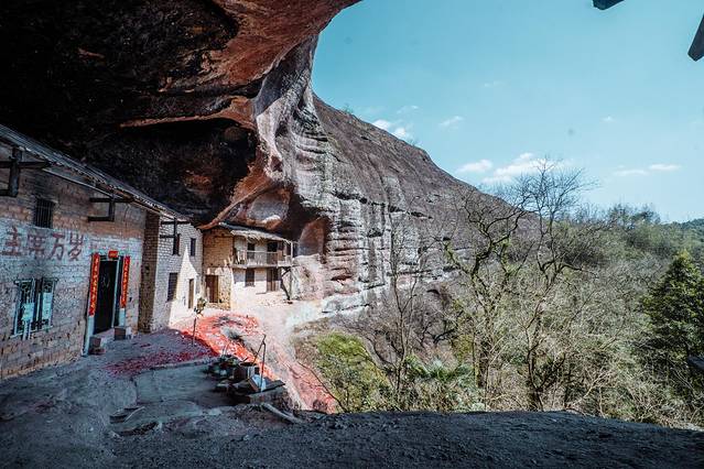 黄坦属丹霞地貌的岩坦,坦深30余米,宽约40米,高约10 米,总面积1000平方米左右。坦洞位居峭壁之上,后依悬崖,前临便江。