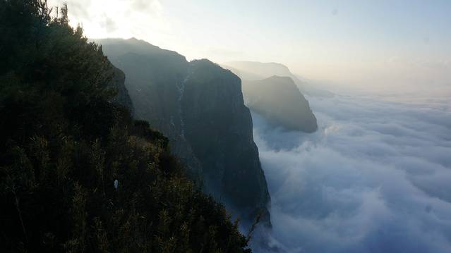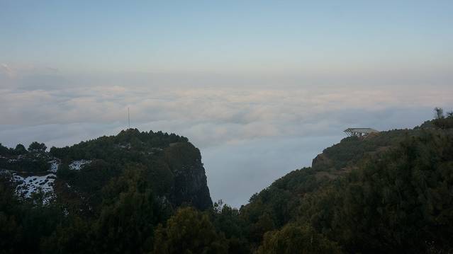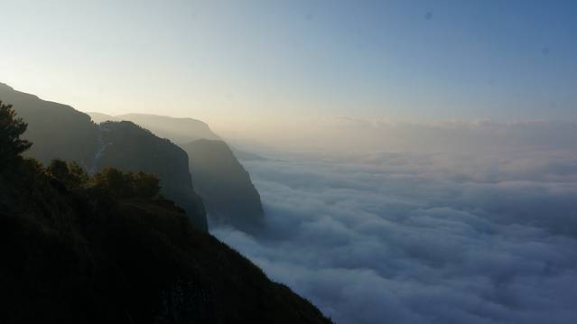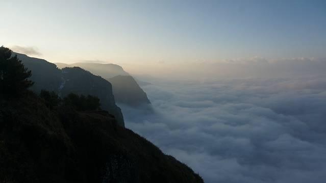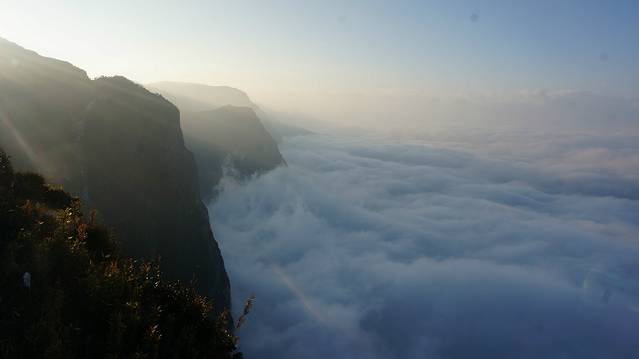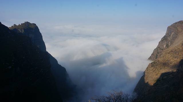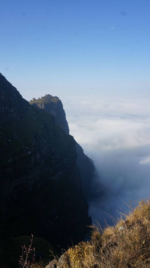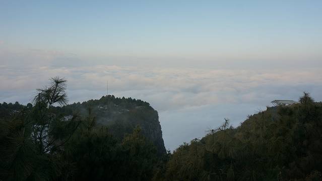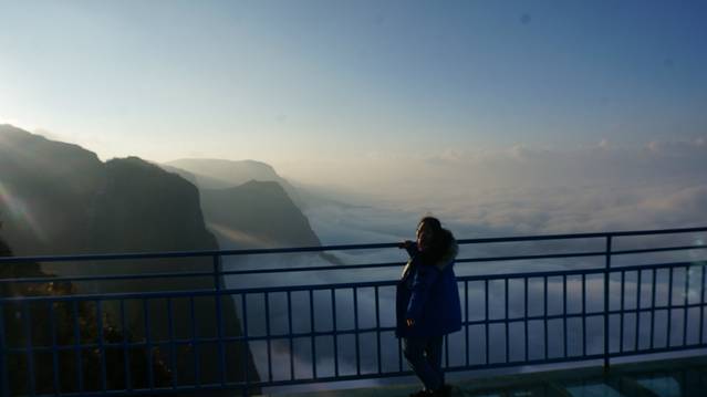 听酒店老板说早上七点半景区就开门了,我很早就起来了,莫名地有些兴奋,七点半天还没有亮,景区游客接待中心还没开门,问了师傅,说8点开门,我就打道回府,黑暗中,遇到四个昆明来的游客,我打算和他们结伴而行。景交车把我们送到大山包的时候,太阳刚刚爬上山头,远远地看去,就是一眼望不到边的正在翻滚的云海,再冷也不觉得冷了。我们几个大叫起来。