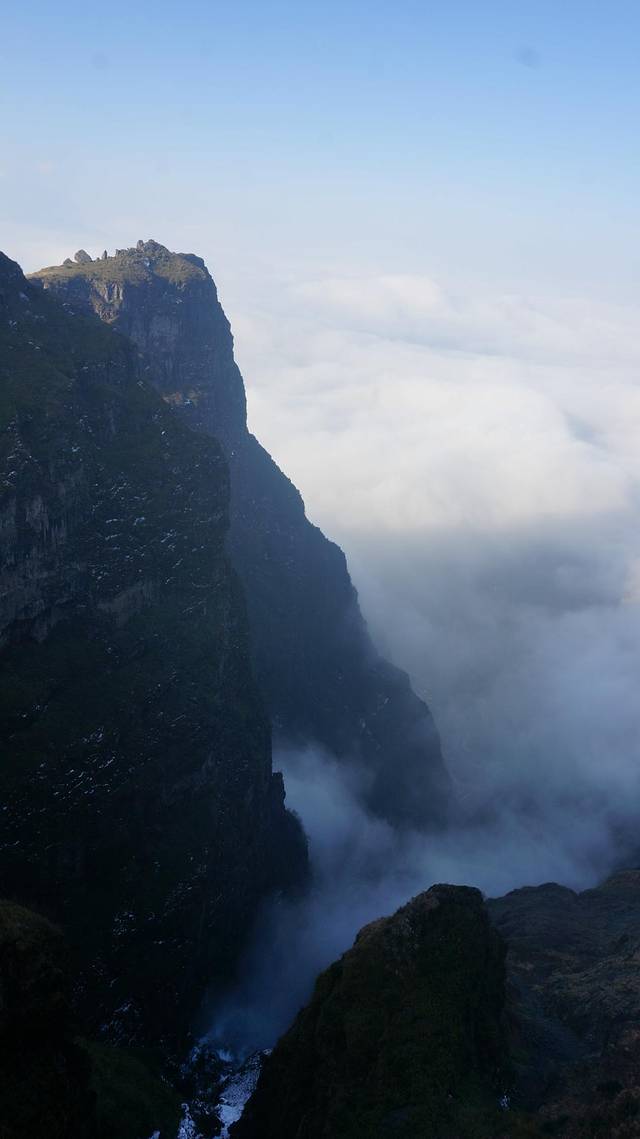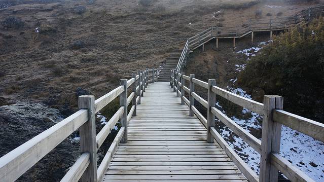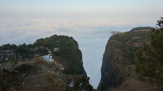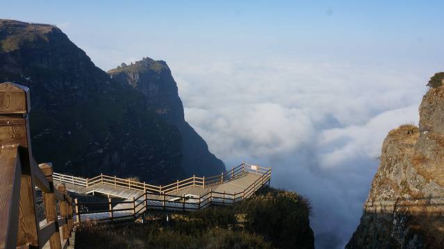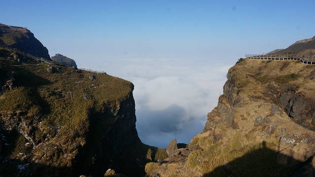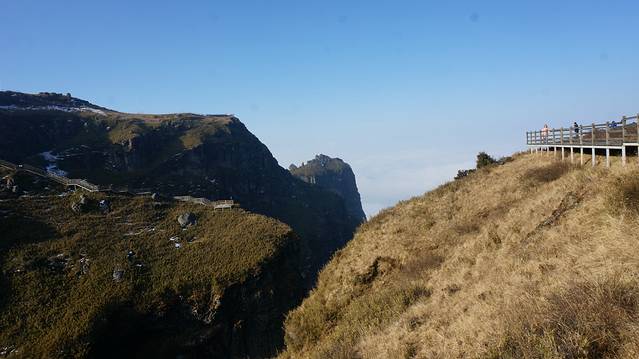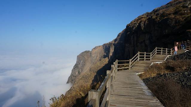 我们选择步行栈道去,马道回。步行栈道因为有冰冻,不是很好走,但沿途的高原景色非常不错。鸡公山的云海,也是大山包美不胜收的绝景之一。