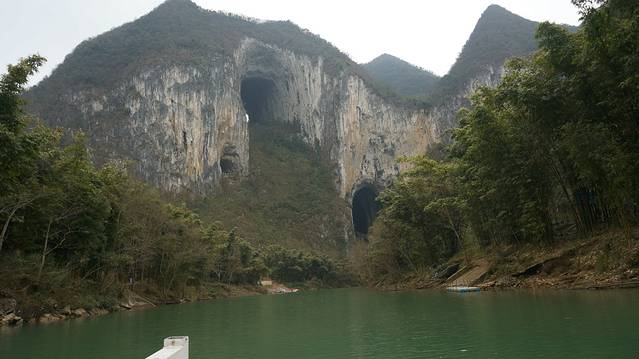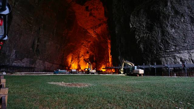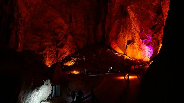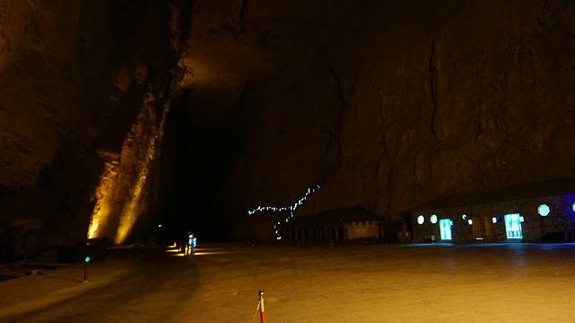 8点45分,正式进洞了,洞口很大,有工人在施工,挖掘机和卡车和洞口形成明显的对比。洞口高72m,宽64m,洞内最高处235m,初步探明洞穴总长度52.8km,其中水洞伏流16.8km,洞穴面积200多万 m2。