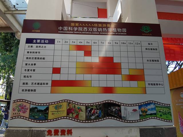 第五天我们逛了中科院西双版纳那热带植物园。总体感觉西区是专门为游客开发的大公园,有很多景点,适合拍照,著名的王莲景区也在西区。如果只玩西区,徒步或者坐电瓶车都可以,电瓶车的停靠点安排的很好,玩起来更加轻松愉快。东区其实只开发了一小部分,更广大的没有像游人开放的区域是热带雨林保护区。东区开发的是热带雨林和绿石林景区,都很原生态,非常有趣,可以体验在热带雨林里穿梭的感觉,看到绞杀榕、树瀑布、大板根、望天树等热带雨林独特的现象。个人非常建议区东区转转。如果西区东区一起玩,一定要坐电瓶车。附上植物园的活动安排,适宜的季节可以参加萤火虫、王莲、观鸟等活动。