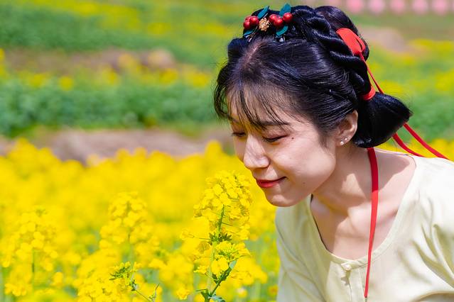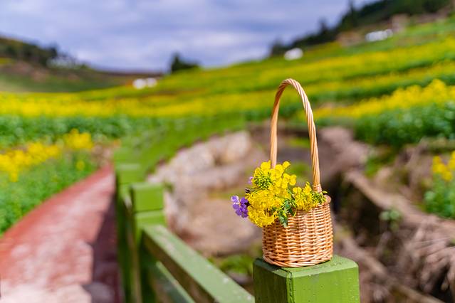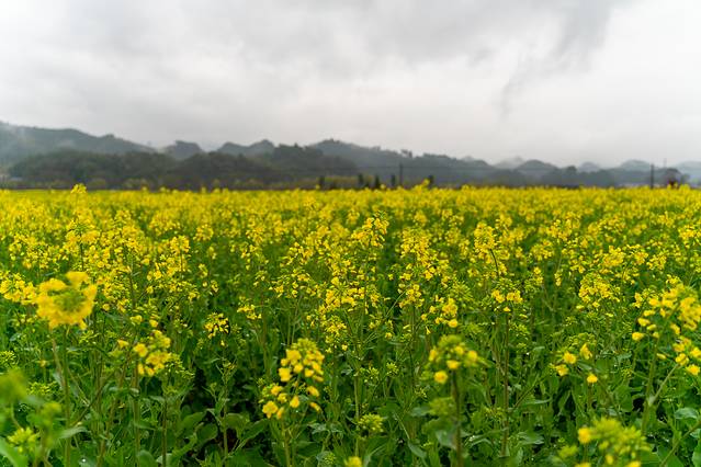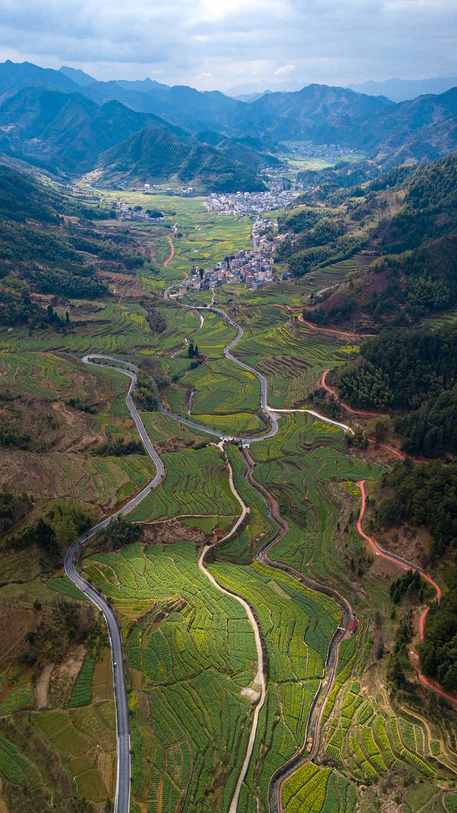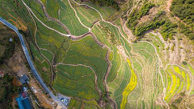 这儿的油菜花是梯田形式的,沿着山路,顺着山坡一直延绵好几公里,用航拍的话还是挺震撼的,推荐用坚构图的形式去表现。天气好的情况下非常漂亮。