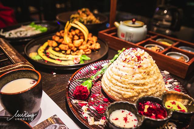 蓝色海洋炒饭:用蝶豆花的天然染色,蓝色米饭和虾仁的完美结合,鲜花做摆盘,很像一个精致的艺术品。