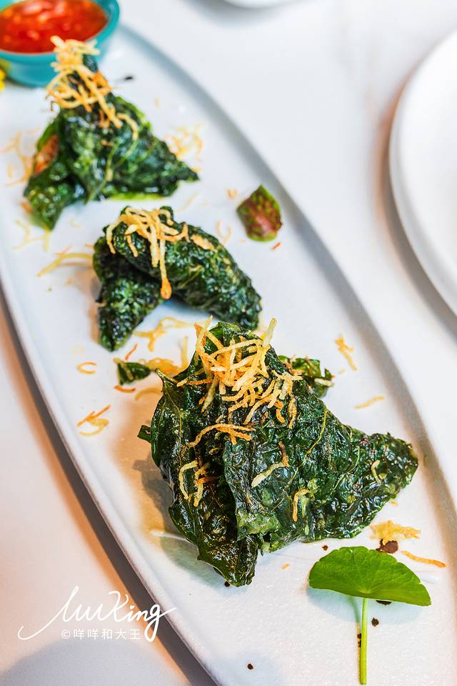 捞叶虾饼:紫苏叶包着超大块的虾肉,过油炸,外酥里嫩,蘸上海南特色的小料,很有东南亚风味。
