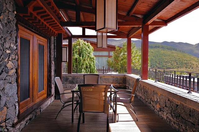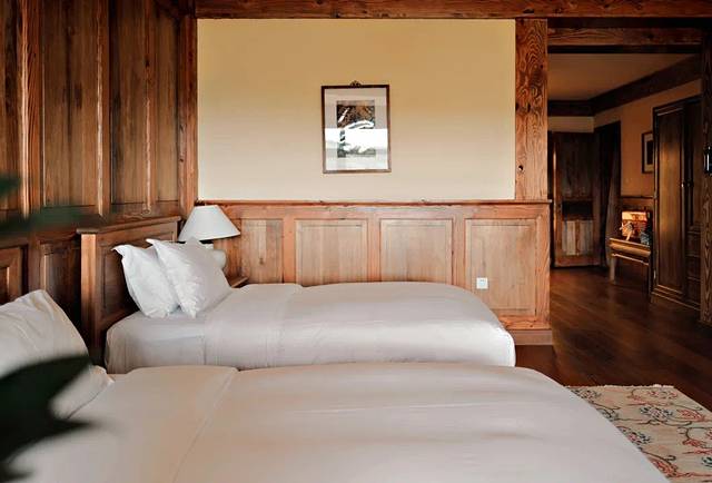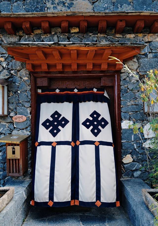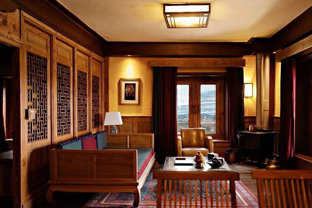 这次我们入住的是豪华套房,浓郁的藏式风格非常可,细节之处都是传统藏式美学元素:房门口的毛毡门帘、雕花整木梁柱、黄花梨木家具、彩色顶缦、漆木碗、织锦、藏毯...这一切都构成了松赞的经典风格。