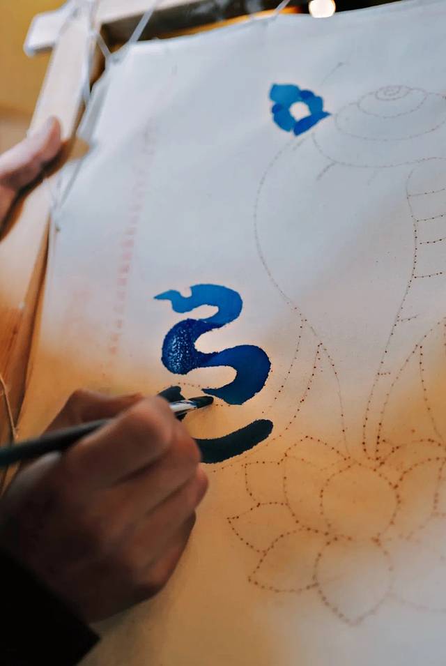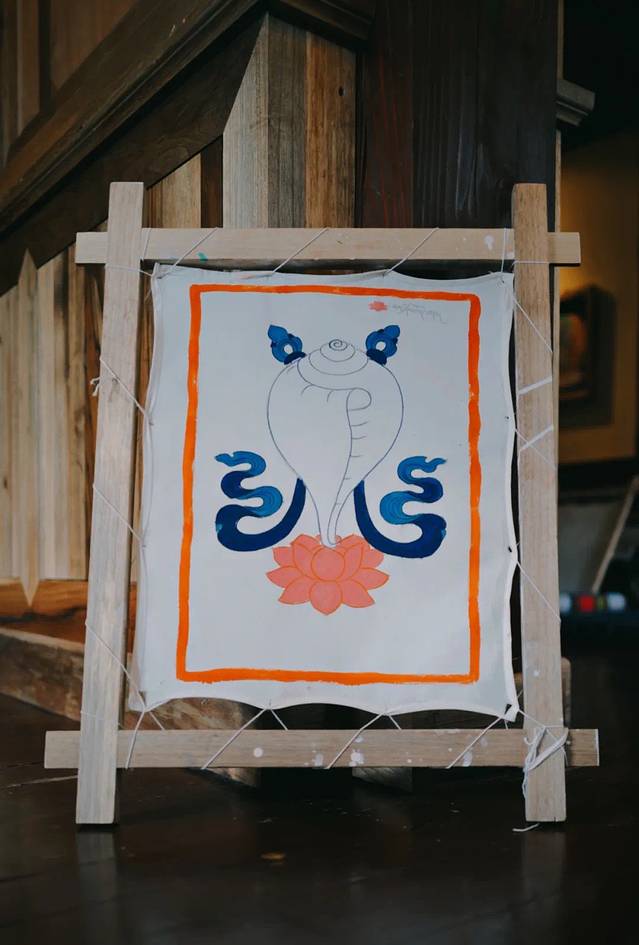 我们绘制的是藏传佛教吉祥八宝-白海螺,两个多小时只能简单勾绘填色,不敢想象唐卡大师们花数月甚至数年绘制一幅佛像作品是一种怎样的修行…