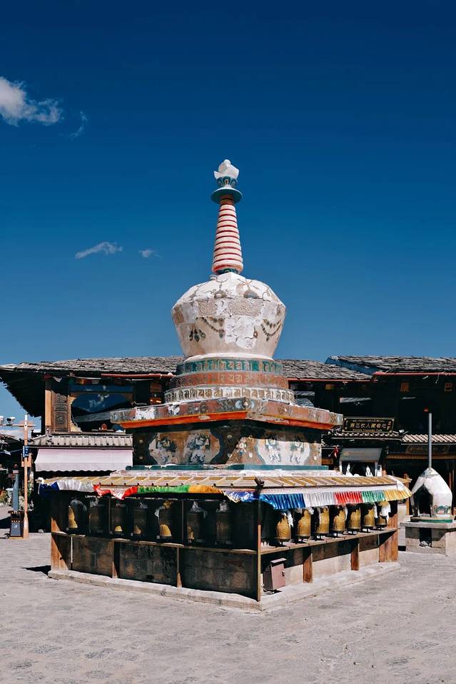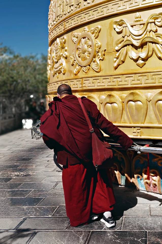 古城还有个号称世界最大、需要十几个人一起努力才能转动的转经筒,顺时针转三圈就会得到幸福和庇护哦~