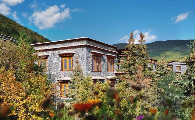 如果说松赞绿谷是温馨古朴的“藏文化博物馆”,那么不远处依山而建的林卡更像是一幅雷诺阿笔下的油画,康巴地区特色的藏式碉房建筑错落有致地隐在山林之间,远处是村落与田园,明艳动人、华美细腻。