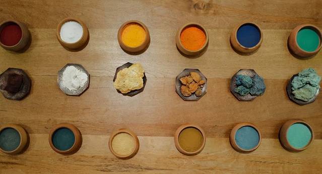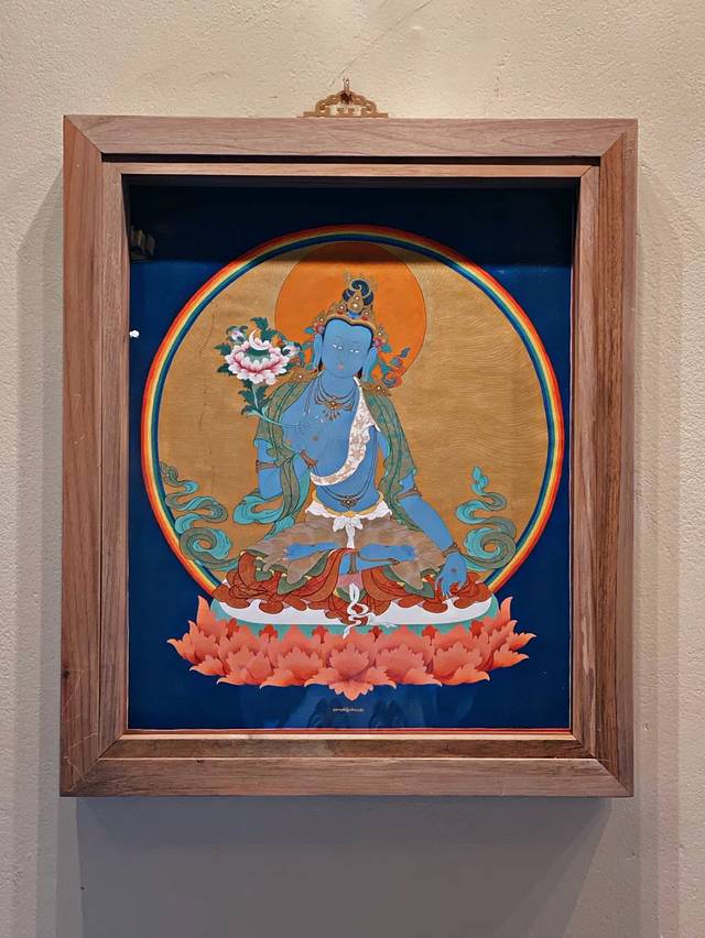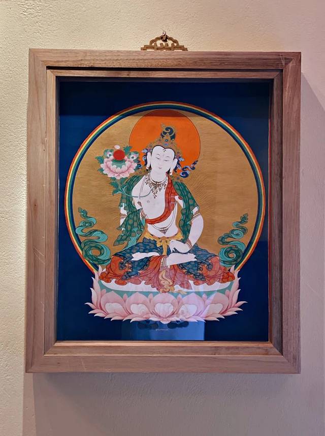 腼腆的唐卡老师先给我们做了个普及,才知道墙上大师的绘作之所以浓郁鲜明,是因为采用了金银、珍珠、玛瑙、珊瑚、松石、孔雀石、朱砂等珍贵的矿物宝石和藏红花、大黄、蓝靛等植物为颜料,以示其神圣。