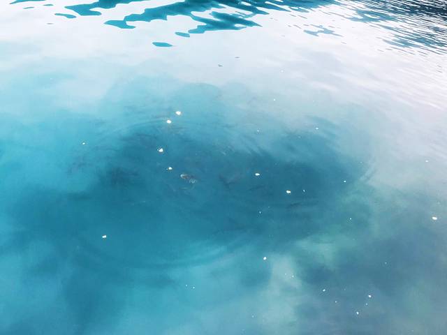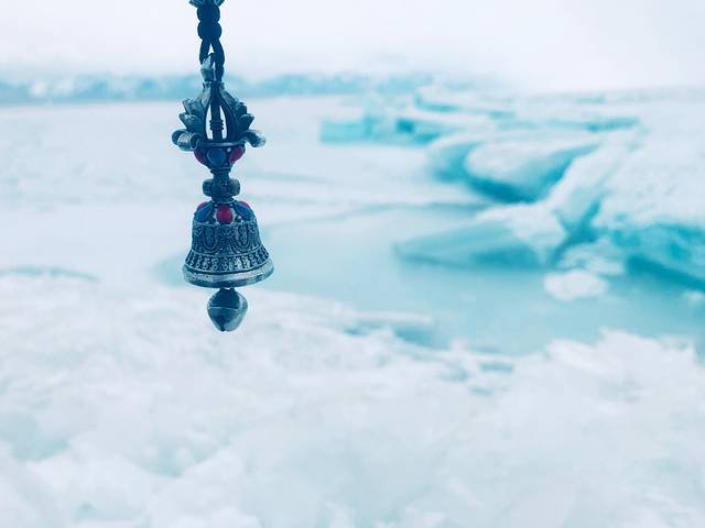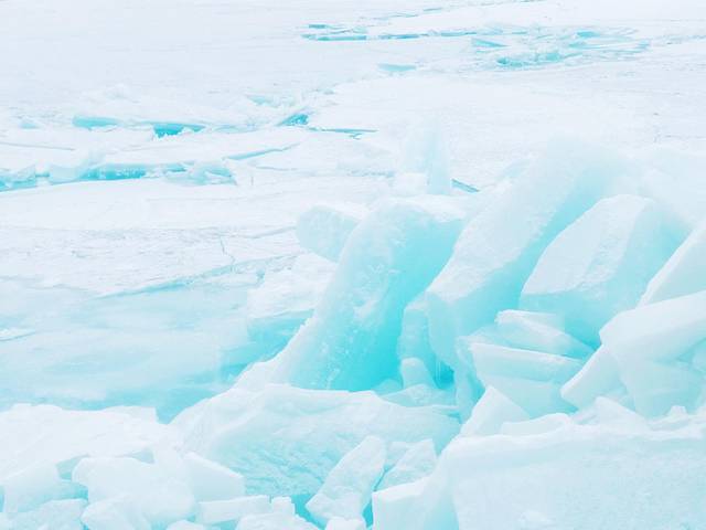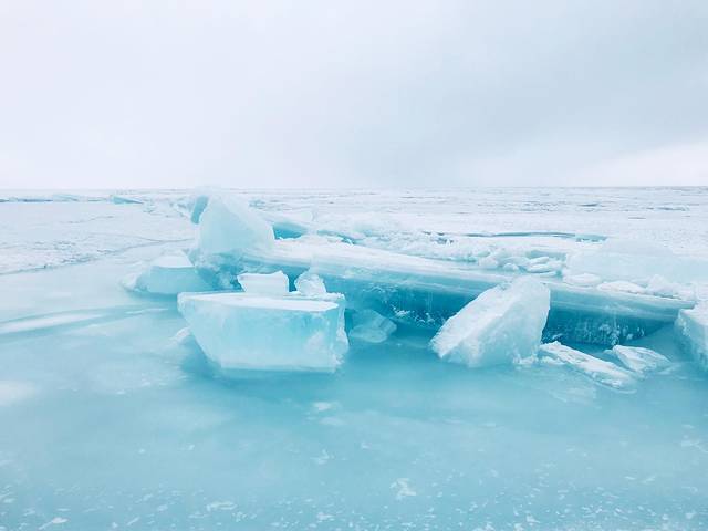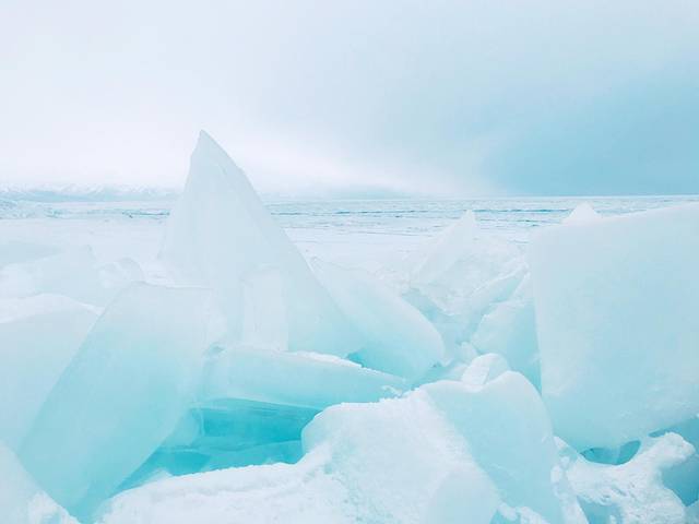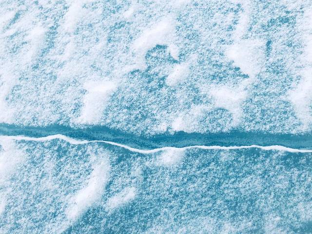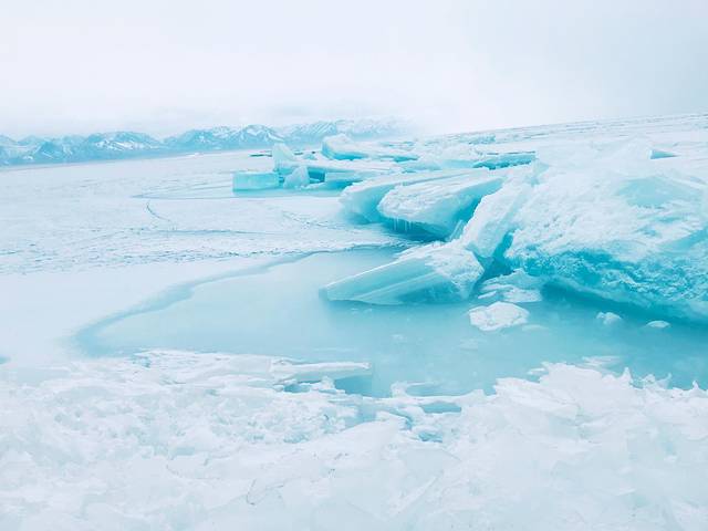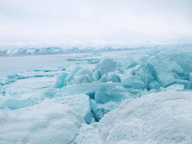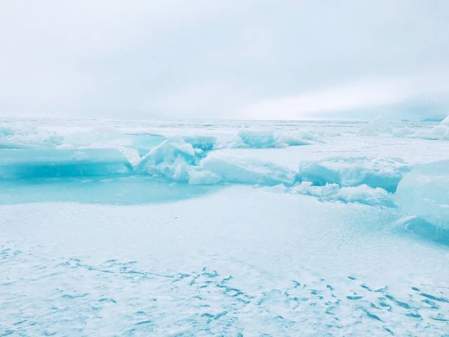 在冰上蹦跶了一会,我们就准备回去了,结果刚上车走了几分钟,就看到湖面上有一块闪着淡蓝色光芒的冰块,真的好美呀,赶紧问司机师傅能不能下车,于是我们和河南的三个大哥一起,就开始了冰上的小探险。