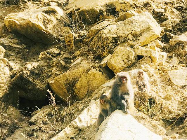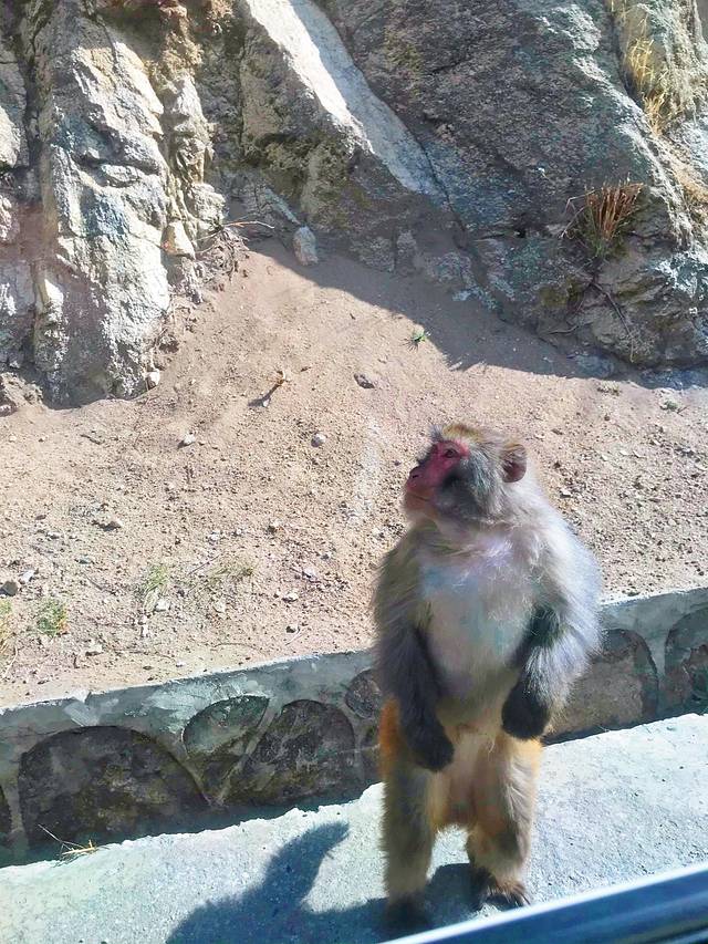 就是在穿越这个隧道之后,师傅突然说,看前面有猴子。刚开始是一只,后来成群的小猴子就出来了,正好车上还有零食,由于比较怂,不敢下去,怕被猴子挠,只敢在车上喂他们。这只大猴子是从头吃到尾,一点都不知道客气,小一点猴子胆子比较小,都站的远远的。