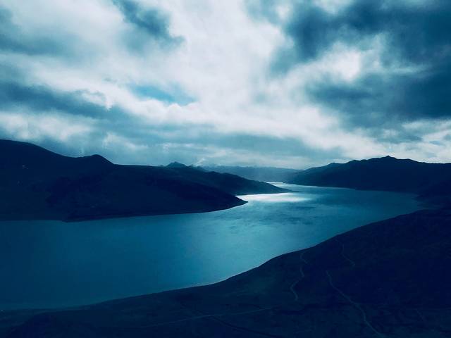 站在这里俯瞰羊湖,简直美得不可方物,今天的云层有点厚,湖水呈现出一种深蓝色,然而远处的天边,竟然透出一道亮光照在湖面上,果然是世界上最美的水,藏族同胞也成它是“神女散落的绿松石耳坠”。