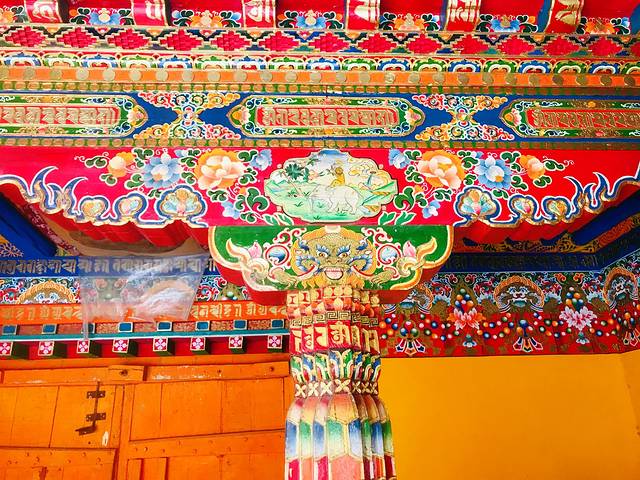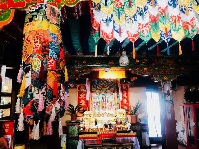 寺庙里有3个大殿,我和花花先去了南边的,一进门就被里面的场景震撼了,大殿内挂满了非常精美的装饰,下面是喇嘛打坐念经的地方,墙壁四周摆满了佛像。再往里面走还有4个房间,里面供奉的是大佛像,因为都是藏文,我们也不知道是供奉的哪尊佛,我虽然不懂,但是当时的环境,真的让人有种深深的敬畏感,所以每一个都会很认真的拜一拜。