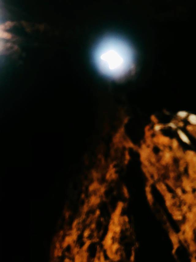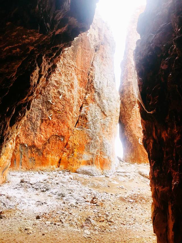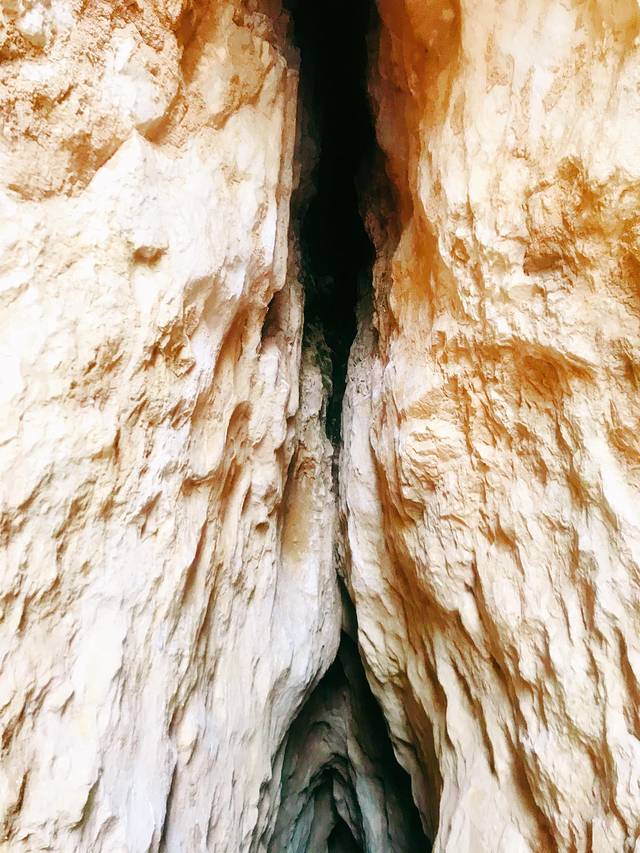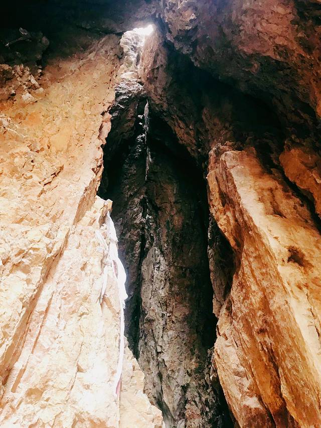 进到山洞最深处,往上抬头一看,群山环抱,就剩了这么一个小口,透进来亮亮的光,这个感觉太神奇了。