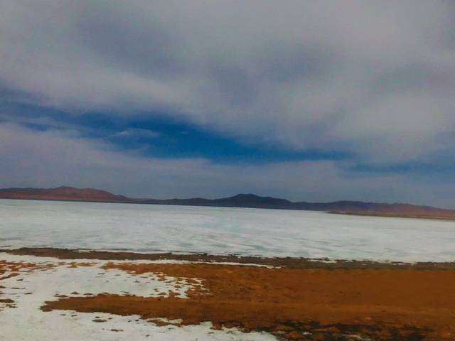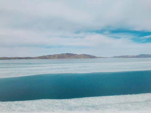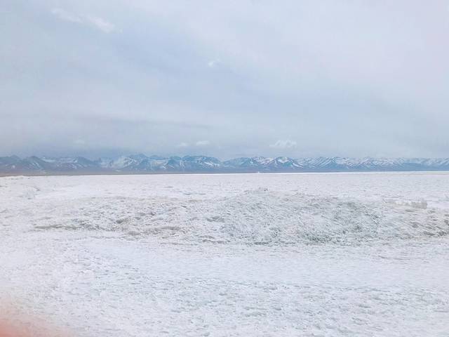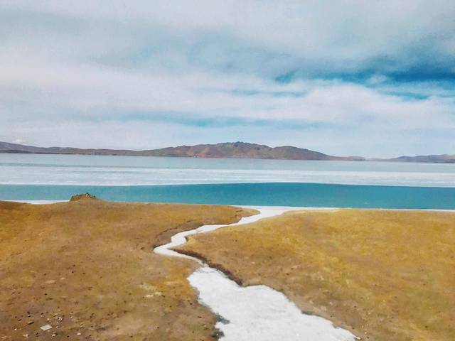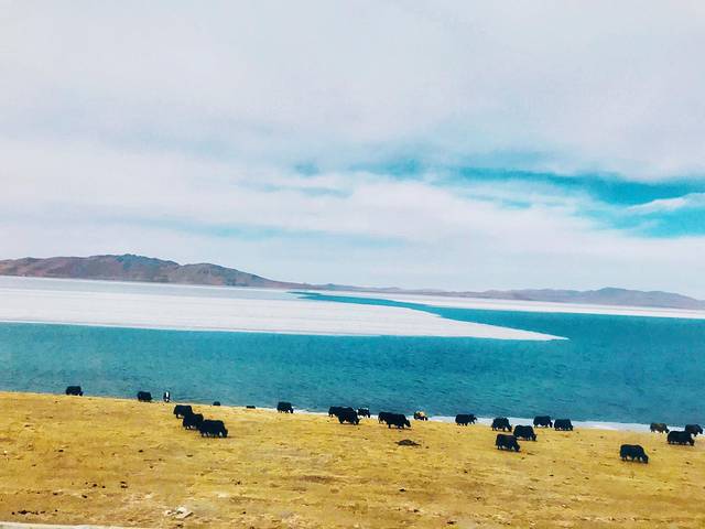 近处的湖面是结了冰的,晶莹剔透,远处的湖面蓝的有点不太真实,天空大片大片的云朵压下来,湖边成群结队的牦牛悠闲的吃着草,开心的血压有点高,哈哈。
