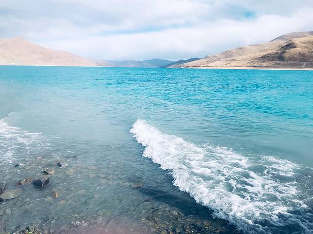 沿着山路继续向下,车是可以直接开到湖边的。这里风非常的大,简直要把人给吹走。湖水不停拍打着岸边,蓝色的湖水晶莹剔透,我找了一块废弃的铁皮挡着风,蹲在湖边,摇着风铃,默默的唱了一首《玉珍》,我想在离天堂最近的地方,借着圣湖的风,在天上的爷爷应该能听到我想对你说的话吧。