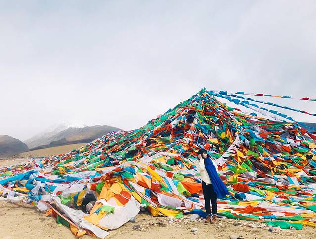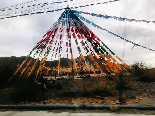 我忘记这是哪里了,前往纳木错的路上,远远的看到好大一个经幡,特别想过去看看,虎虎师傅就把车停在了一遍。一下车我就后悔了,这个风大的呀,简直了,我第一次觉得我吃的太少太瘦了,整个风直接吹到脑仁里,感觉脑袋嗡嗡的。大概几分钟的路程吧,走的真是相当艰难,旁边还有一对新人再拍婚纱照,简直太牛啦。