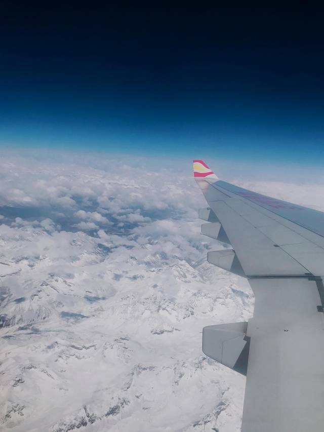 坐上飞机之后,建议大家前半个小时不要睡觉,因为窗外的风景太美了。这些天我们一直仰望的雪山,此刻全部都在脚下。连绵不断的雪山,上面盖了一层厚厚的云朵,好想跳到云彩上睡一觉。而且,我竟然看到了羊湖,虽然手机没信号看不到地图,但是我确认,我看到的那个就是羊湖,这种激动的心情,不知道怎么说才好了。此刻我们身边的花花已经睡着了,算了,一会等她起来给她看视频吧。