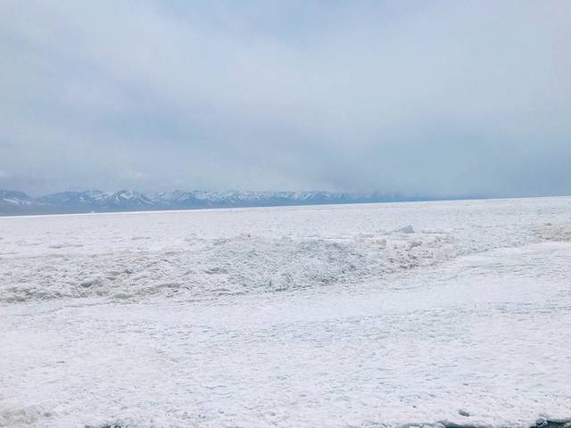等我再走到湖边的时候,雪基本上已经停了,终于看到了纳木错的真面目,一望无际的湖面上,全是白色的冰,整个天空灰蒙蒙的,真正的湖天一色。