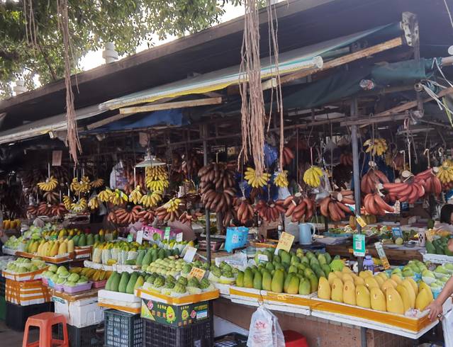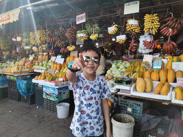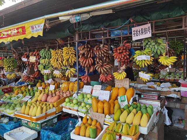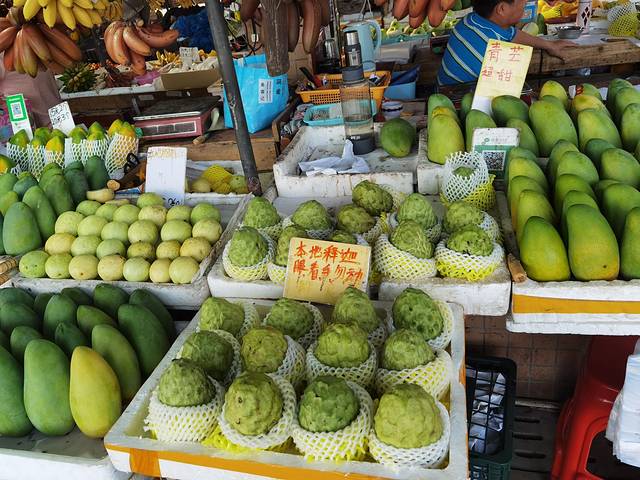 先说水果吧,你一走近这里的水果摊位,就会被这里挂得琳琅满目的各色水果所吸引,主要是红、黄、绿三色,有点到了泰国的感觉。这里的芒果和木瓜个头都很大,香蕉和芒果都有红、黄、绿三种颜色,每个档口都可以试吃。水果有便宜的有贵的,像杨桃,番石榴,香蕉这些,十块钱一大份,还是很划算的,但有的像释迦果这些小众水果就卖得比广州超市里面还要贵。总体来说,这里的水果给人的感觉就是“多”和“大”,真想每一样都拣一点回家。