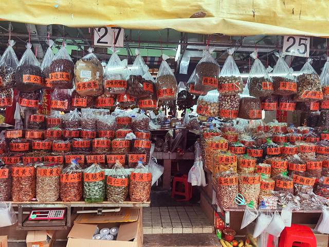 除了新鲜的海鲜还有很多煲汤用的海鲜干货,像咸鱼、海马、海星、花胶这些,基本上和海产有关系的这里都有得卖。