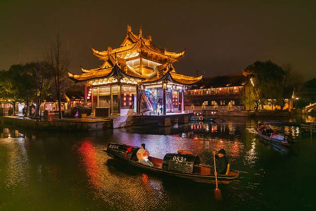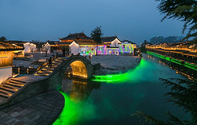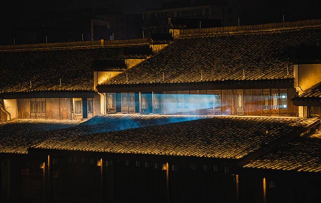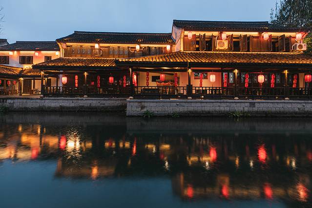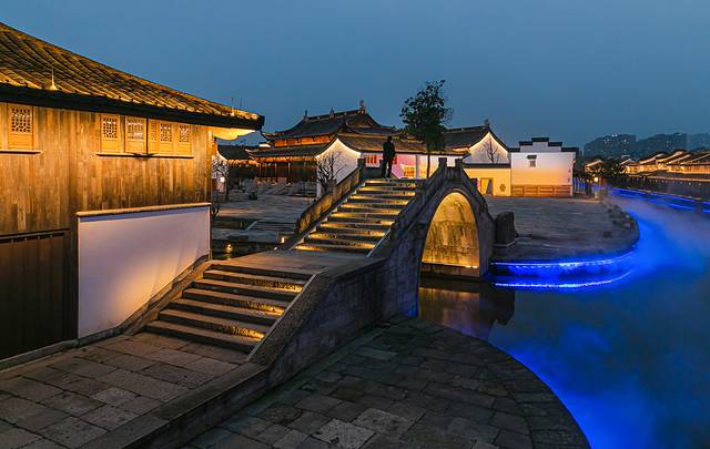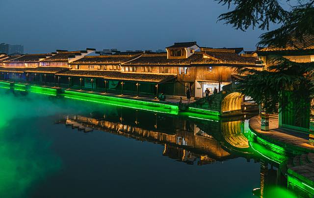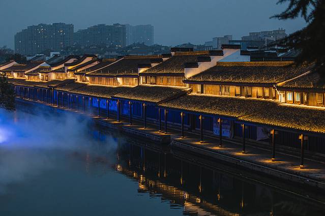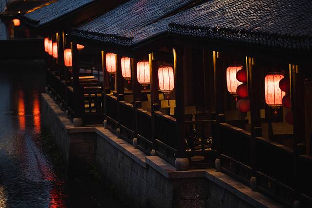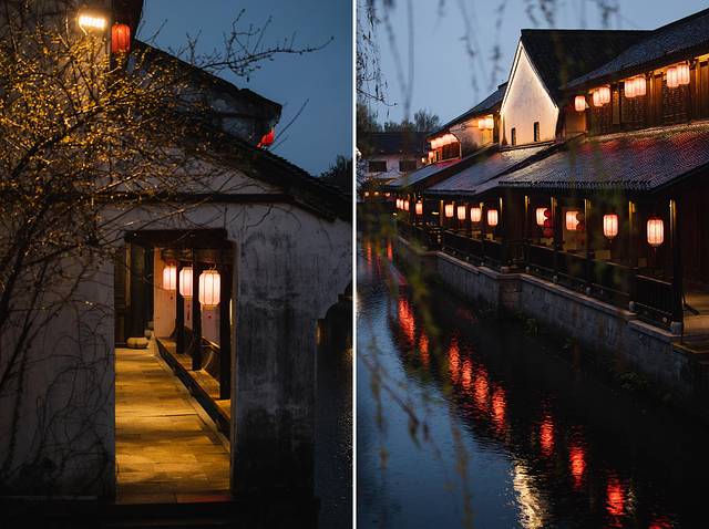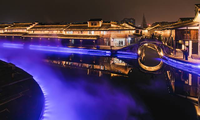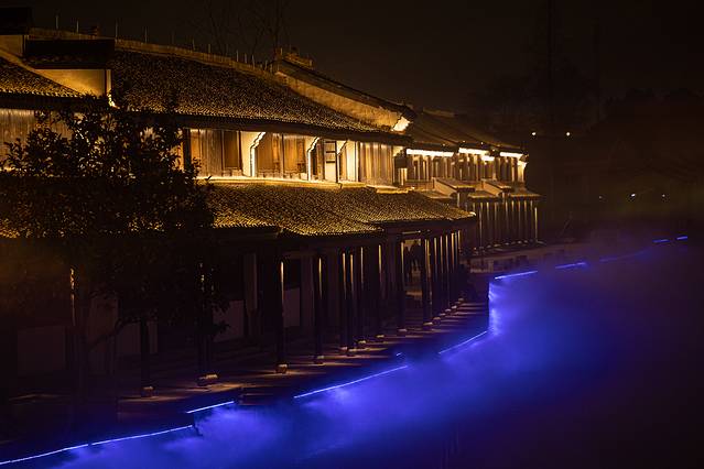 而这光也不似城市里的光一样绚烂,这里的光恰到好处,并不喧宾夺主,让古镇仿佛回到了古时的灯火辉煌,在水汽之中,又似仙境一般。