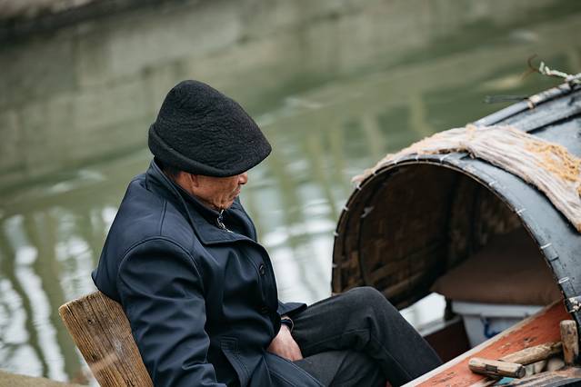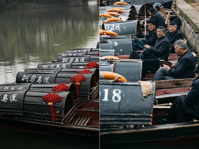 参观完柯岩,行至鉴湖,在码头上整齐地停靠了一排老式的乌篷船,船夫都是当地的老人,闲散地靠在船上,静待游客的到来。