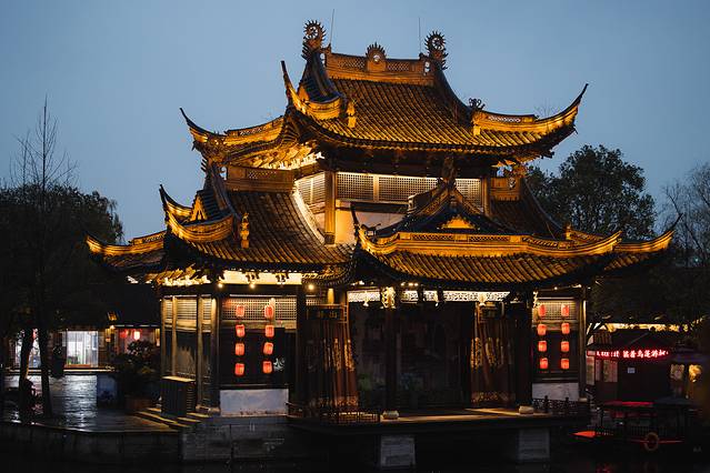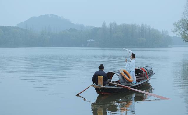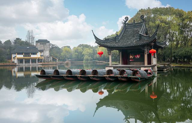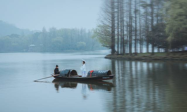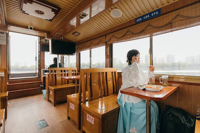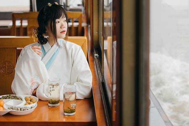 古香古色的船只在湖面上悠然前行,划出一条白色的波浪,船外风景如画,船内雅致整洁,点一杯茶,一些小吃,享受静谧的度假时光。