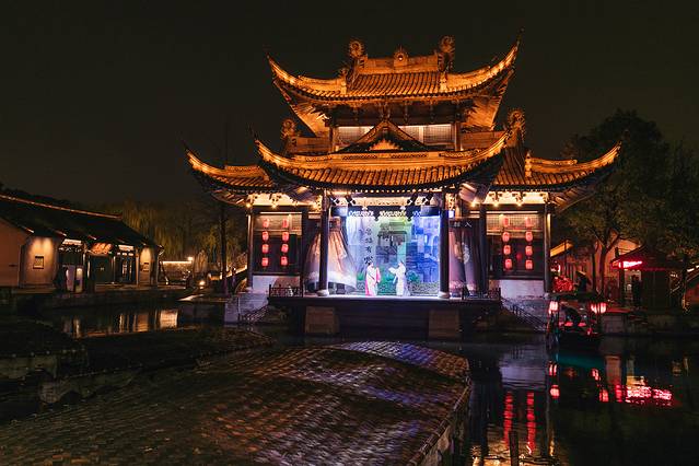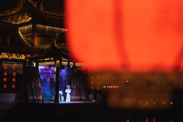 一河一湖两街,或是坐船,或是步行,慢悠悠地欣赏着这座人造的小镇,却感觉这里和绍兴一起,存在了无数个岁月。灯火通明的戏台上,正上演着鲁迅先生笔下的社戏,在黑夜里甚是引人注目。