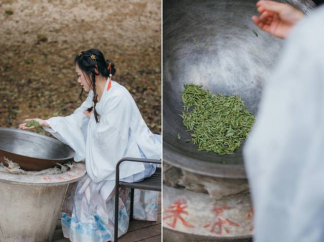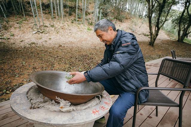 当地的村民大爷为我们展示了炒茶的手艺,同行的小姐姐也好奇的动手试了一下,茶叶褪去水分,微微卷起, 很有感觉。明前茶的口感和品质都是很好的,这个茶还有个名字叫做好运茶,更是添喜气。