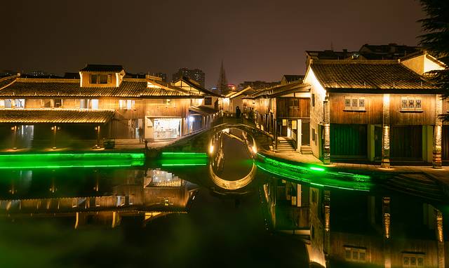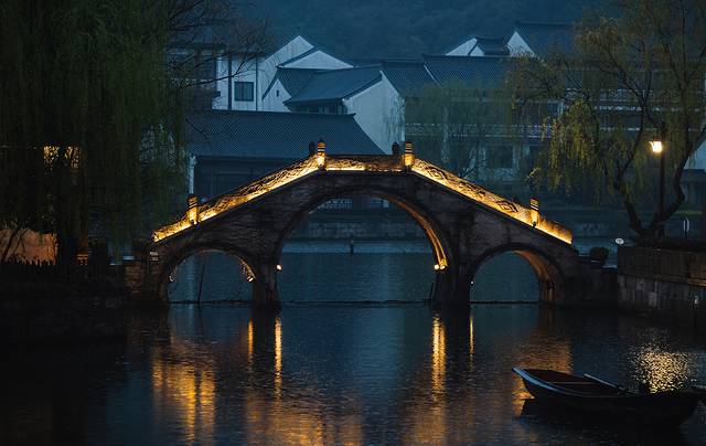 白日里的古镇恬静淡雅,而到了晚上也是别有风情,光为古镇镀上了一层迷人的色泽,在桥上,在水里,在房屋之中,透着幽幽的光,更是柔情十足。