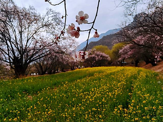 桃花园的桃花比桃花沟的更密集一些,桃树也偏低矮一些,因为有油菜花的点缀,这里,嗯,貌似更好看。