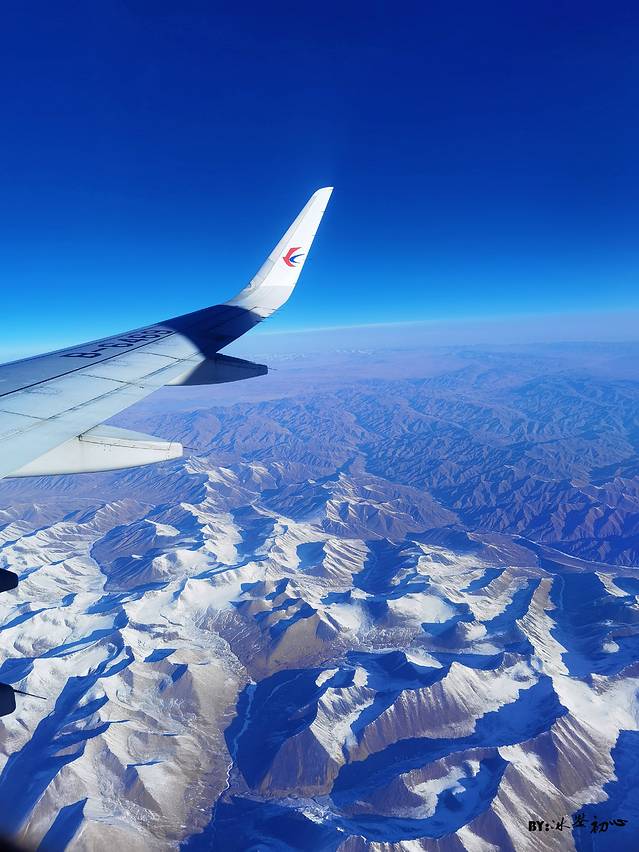 飞机进入青藏高原,小伙伴和我没有丝毫困意,一直盯着窗外风景,贪恋地欣赏着雪域盛景,看底下连绵起伏的山峦,山顶堆积的白雪。