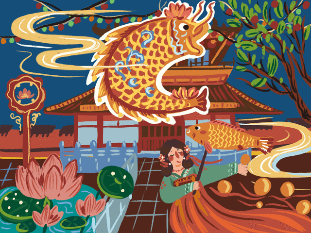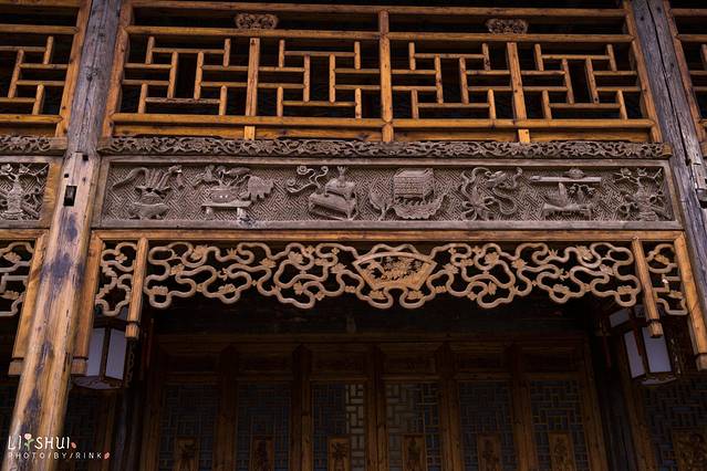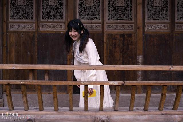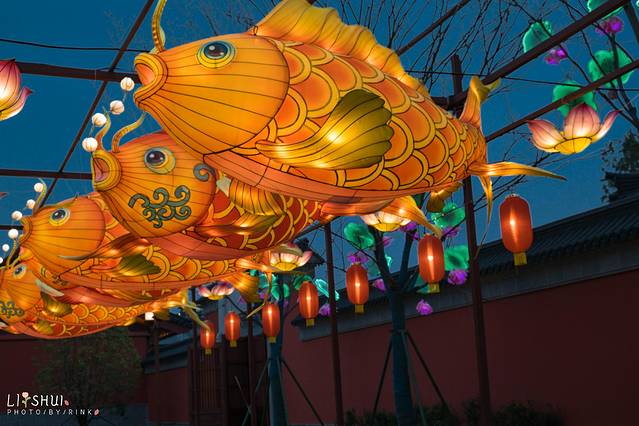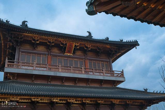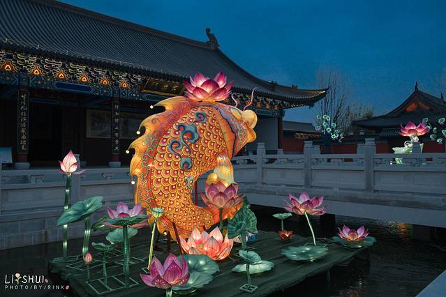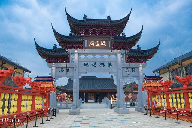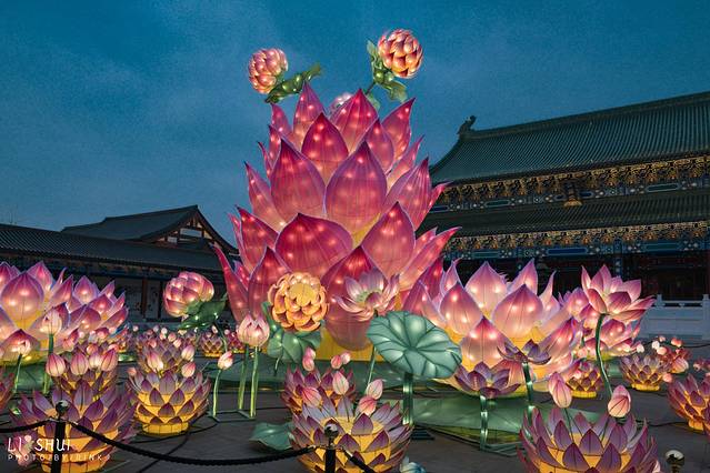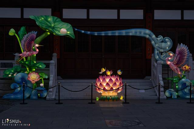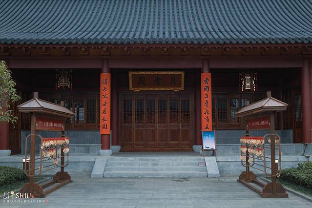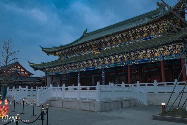 月老殿前,可以祈愿挂福牌,用红绳系在一处。夜色中一盏盏荷花灯缓缓亮起,点点光亮照入了小镇梦境。红色的墙和绿色的竹林围成了一个古韵的所在,要是身着襦裙汉服在合适不过,有种梦回大唐的兴奋之感,大殿恢弘的房檐将深色的夜幕划出了优美的构图。庆幸现在还在试营业阶段,游客并不多,可以好好拍个够。