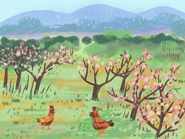 在山间小路游荡,发现桃林深处传出阵阵鸡鸣声,举目所见,皆是 春日 风物之美,鸟叫声零零碎碎,让人觉得安稳 和平 和,是旧时画里的场景。
