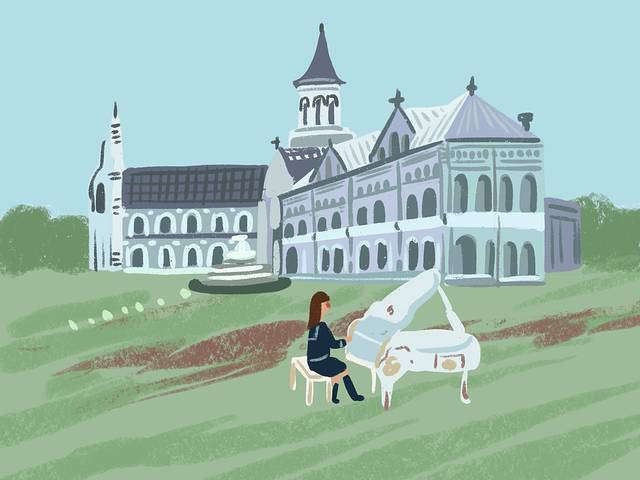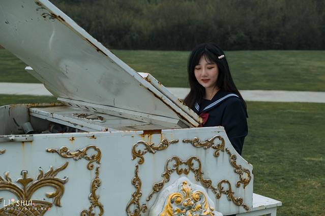 从景区门口到大教堂要走不少路,我们是开车进去的,在教堂后面空地的小路上停下,有不少车子都是停在那里的,很多婚纱影楼的团队已经拍的不亦乐乎,教堂门口是有马车和白马的雕塑的,这就非常的影楼写真风,我觉得比较好拍的是,教堂背面的钢琴这里,这是一架模型钢琴,坐上上面假装演奏,有周杰伦mv中的氛围:“为你弹奏肖邦的夜曲,纪念我死去的爱情……”,演着演着就忘乎所以了。