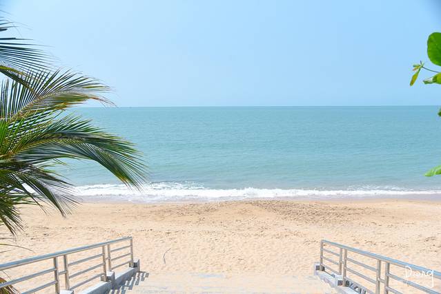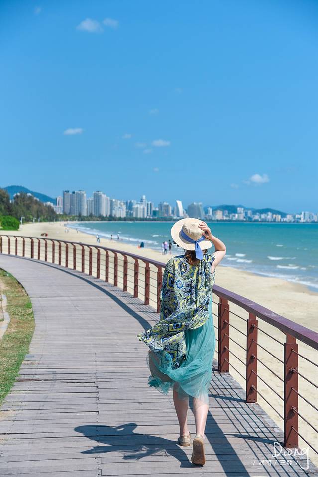 有一段没有树荫的临海木栈道,洁净沙滩,碧蓝大海,阳光晴好,心情也不自觉飞扬起来。