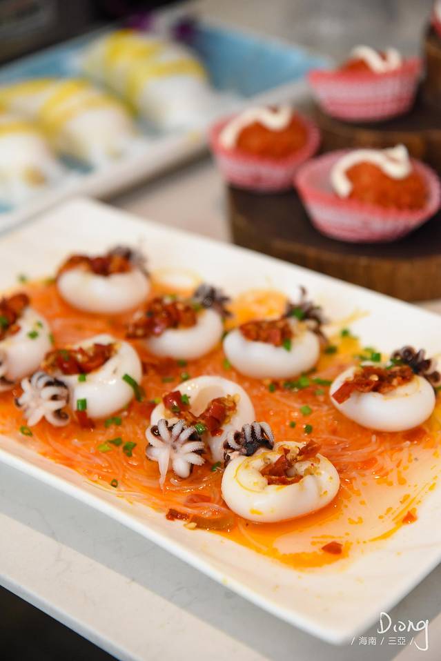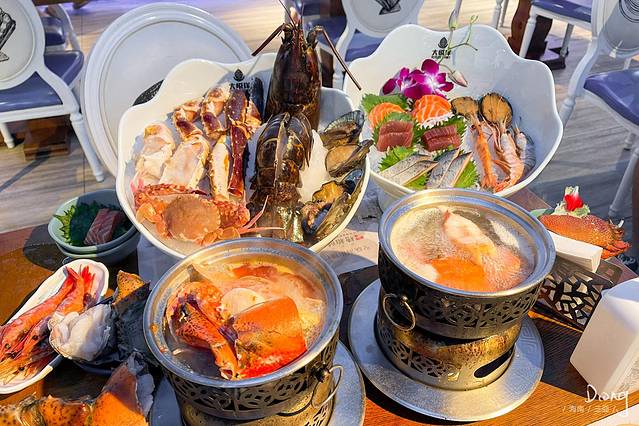 餐厅环境也很好,大厅有垂下来的灯幕,还有水母装饰轻轻摇曳,就像是梦幻海底,室外还有270度无死角看海露台,迎面就是大海的气息,想要坐室外海景位的话,一定要早点来。