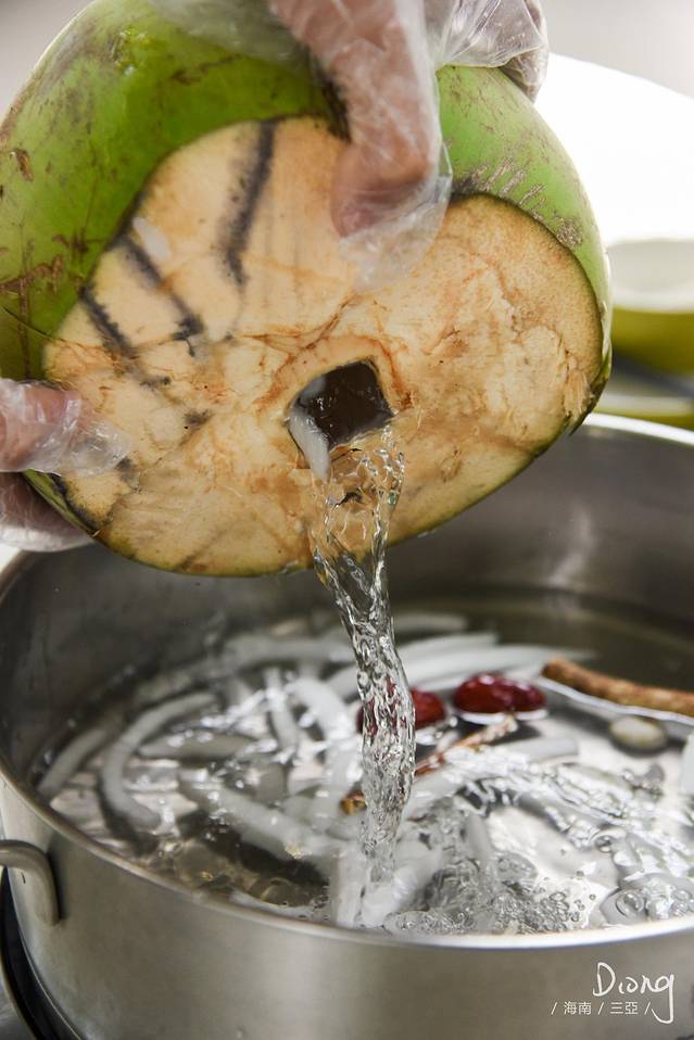 服务员现场把椰子开了,然后清澈的椰水咕噜咕噜倒进锅里,三个椰子组成了火锅的锅底。
