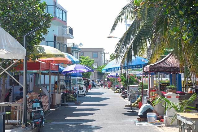 走不多远,就到了渔村的入口,主干道叫西岛市场路,说的就是这一条摆满路边摊的市场,有水果,小吃,成堆的椰子,摊主大多是原著村民。