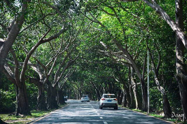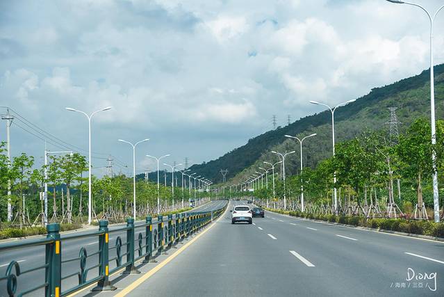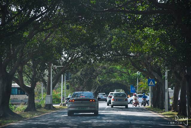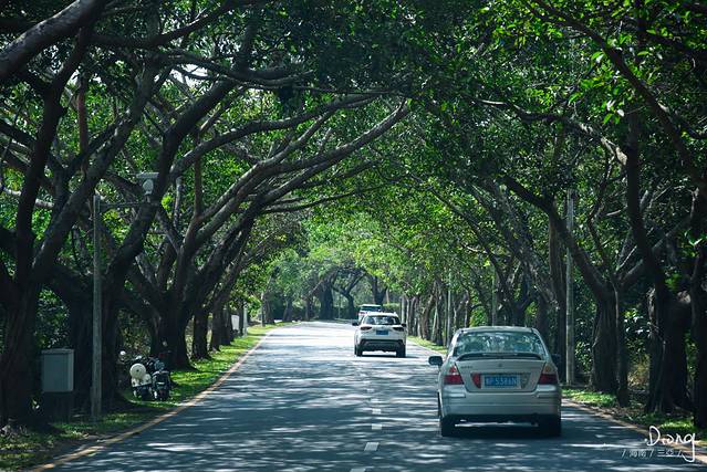 导航过去,会先经过亚龙湾路,路两旁的植物伸展着茂盛的枝干,像是在天空中拉起了手,车走在里边,就像是在穿越一条时空隧道。
