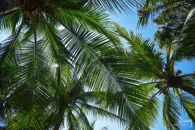 椰树的叶子神展开,盖在头顶,阳光被切成一缕一缕,热度也消散不少,细细听,叶子摇曳的沙沙声和海浪的哗哗声叠加在了一起。