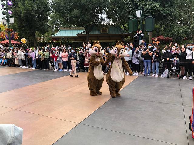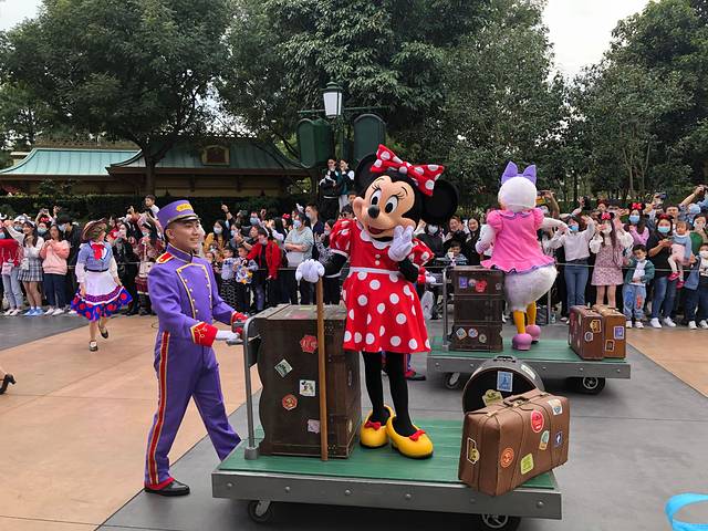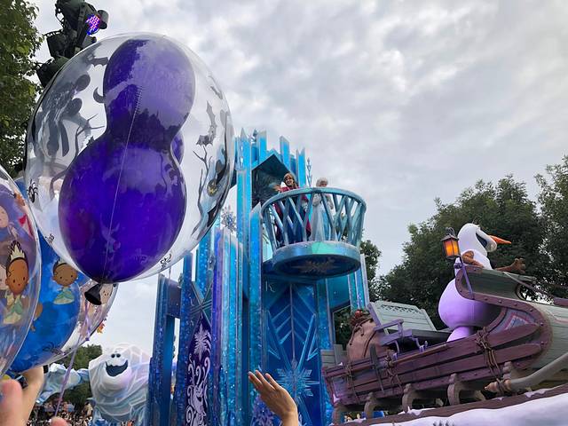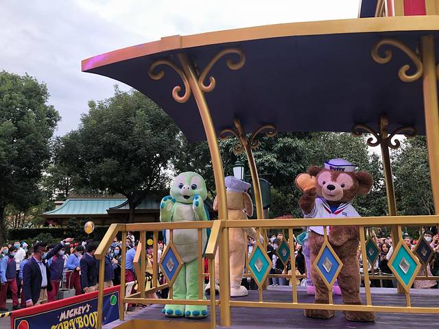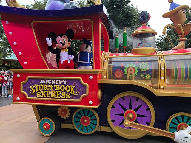 卡通明星是绕着主道路,坐着花车,一路上都有得看,站着主路旁边就能看完整场巡游,大概是40分钟左右。