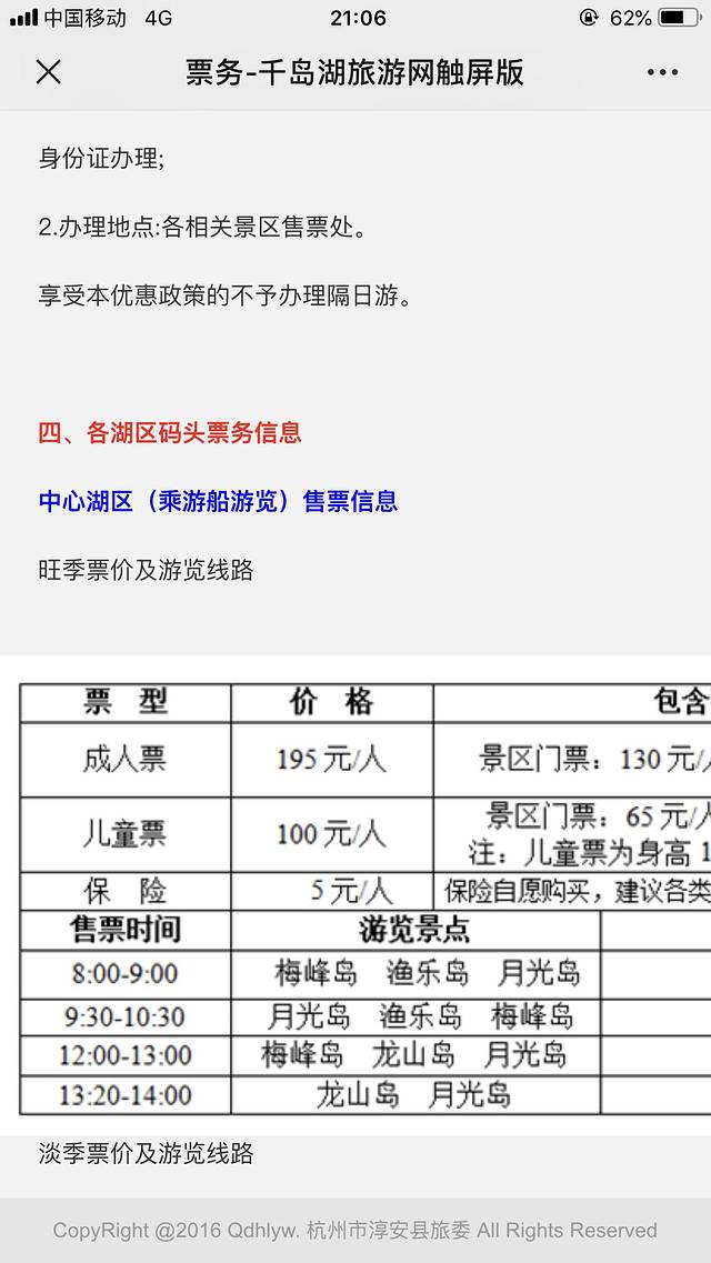 门票:千岛湖东南湖区 10元续票手续费+98元上二楼舱船票