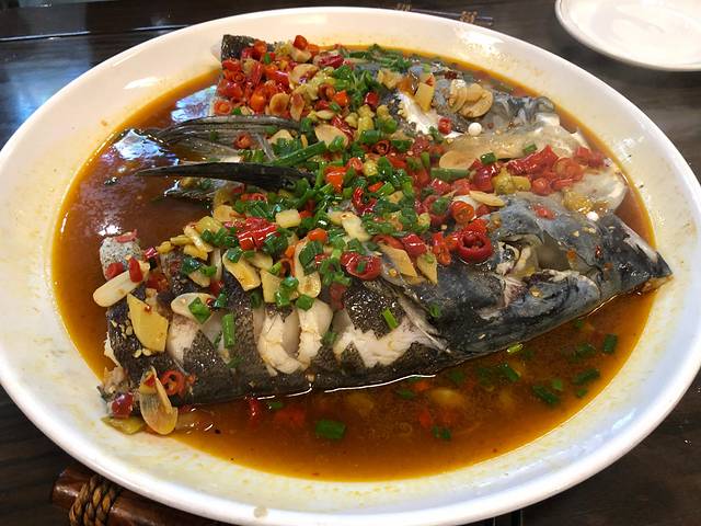 看到一家店铺人气蛮旺,来到当地就肯定想吃吃,结果老板说包头鱼只剩下5斤多,但是我们才两个人,但是真的很想吃,就点了,结果真的不后悔,鱼尾要是做汤就比较好。鱼头做了剁椒,真的骨头都不剩,我们还炒了个青菜,就真的吃不下了。