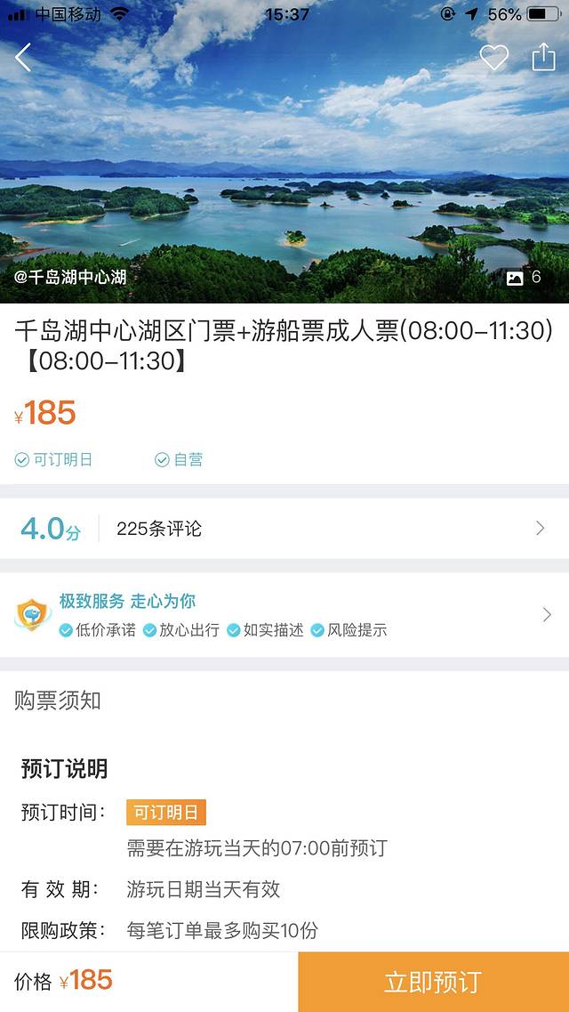 我们在去哪儿网上购票的,优惠10元,也可以在现场购票,票价是195元,包括了景区门票130元,游船65元,我们因为想走到二层外面,就加多33元,游船98元。(千岛湖风景区 公众号上都有介绍,可以查看)