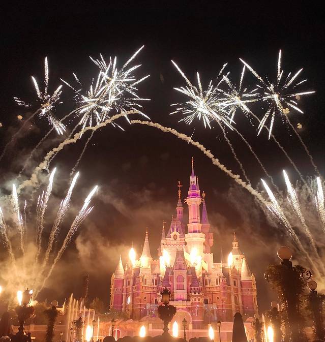 一看到反派巡游,我们赶紧过来前花园看烟花,真的人头涌涌,坐好了位置千万不要拉乱走动,我们就是去了一趟洗手间,出来的时候位置都没有,只能在边边上看了。
