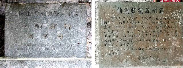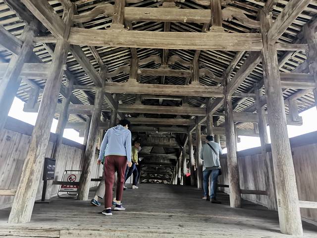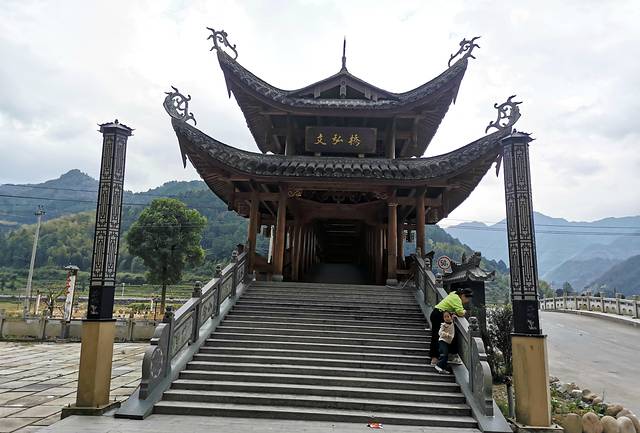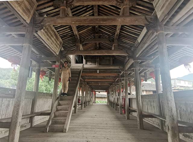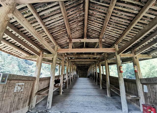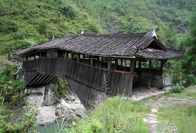 桥拱上建有廊屋15间,当中高起的几间为楼阁。屋檐翼角飞挑,屋脊青龙绕虚,颇有吞云吐雾之势,无桥墩,由粗木架成八字形伸臂木拱